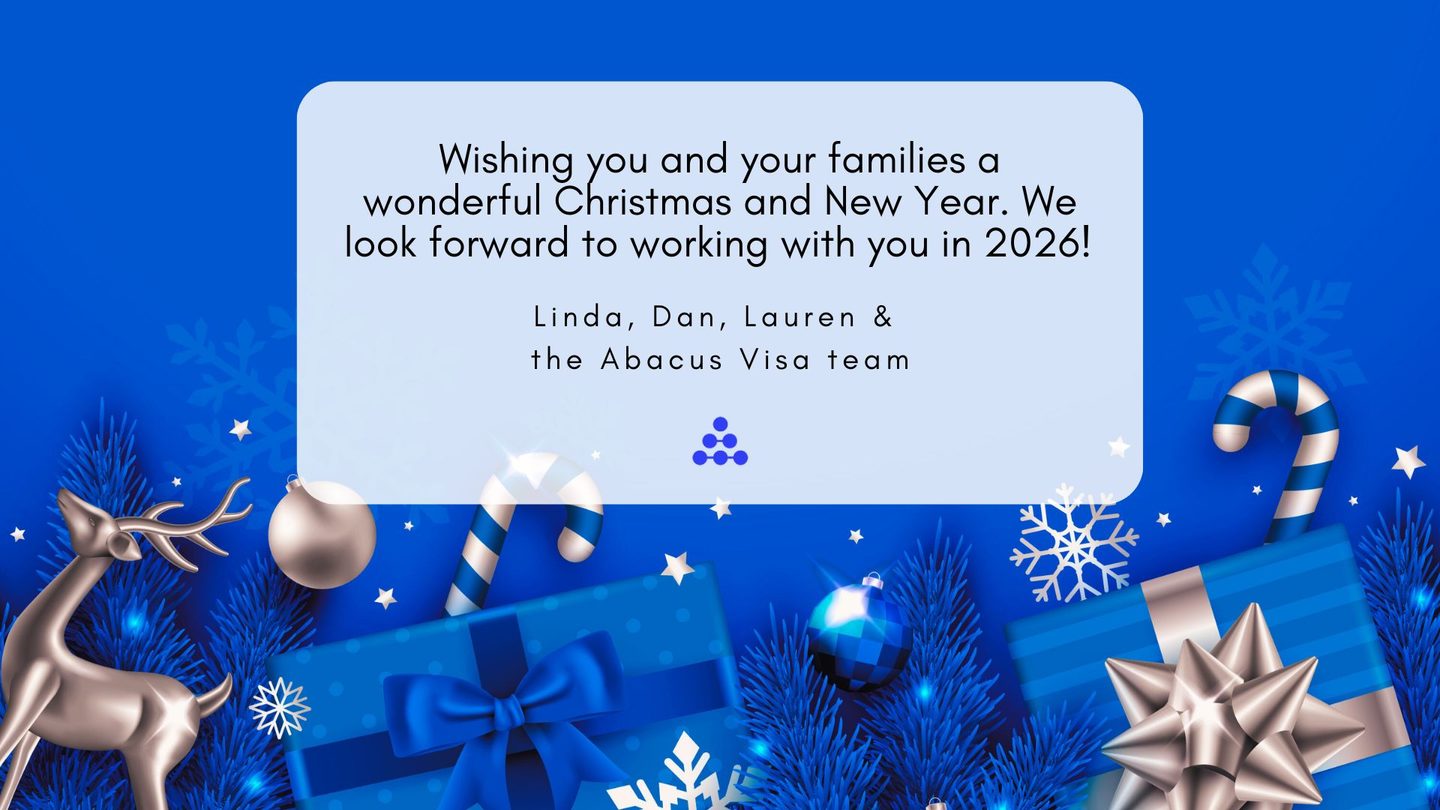 Abacus Visa will be closed from 22 December 2025, reopening on 5 January 2026. We wish you a wonderful festive season and a well-earned break. Thank you for trusting us with your migration needs this year. We look forward to continue supporting you in the year ahead.